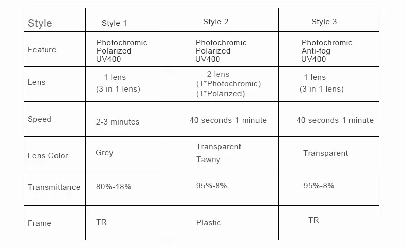 - Style 1 is the 3 in 1 lens, Photochromic Polarized UV400 in 1 lens