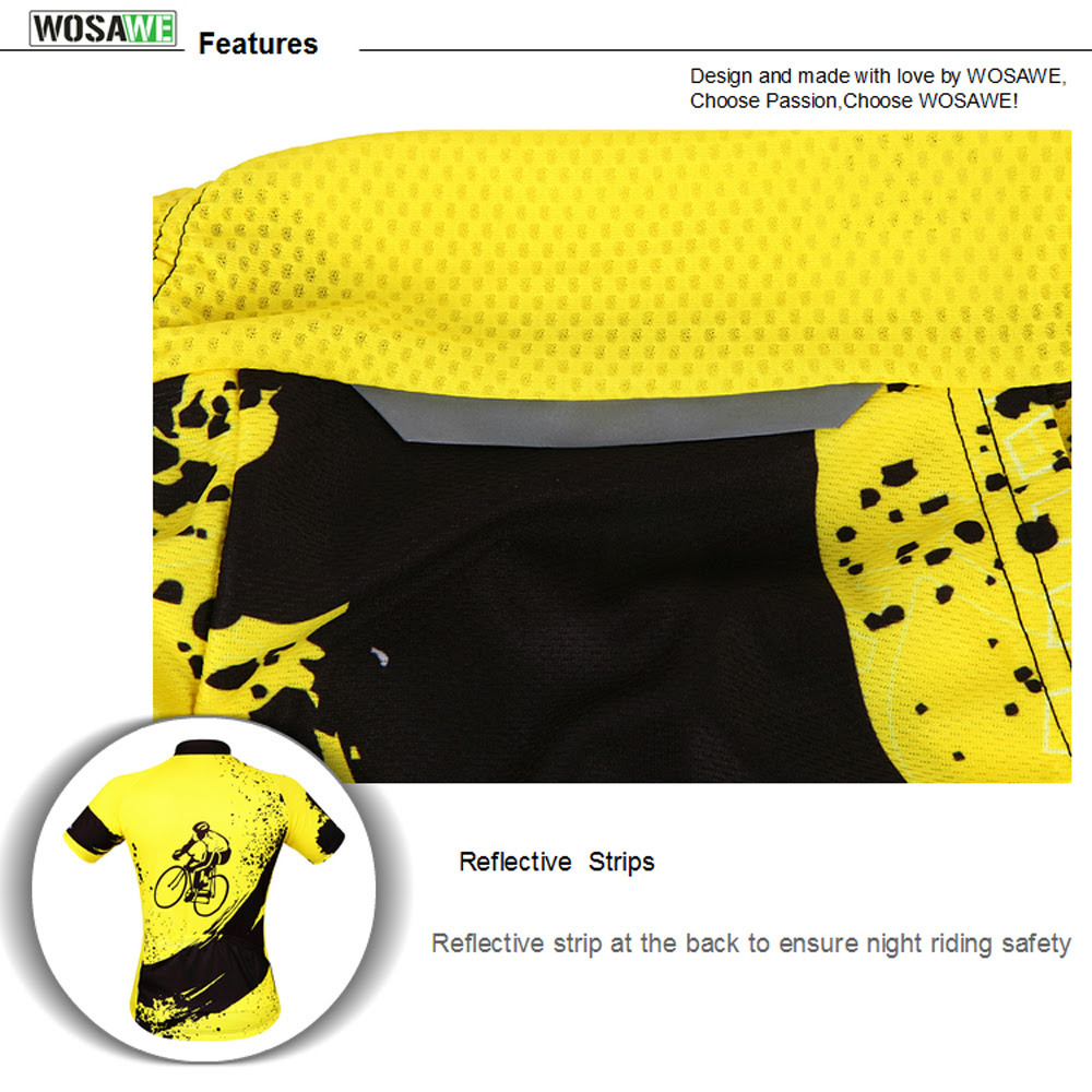 Features:Unique mesh fabric under armpit for keeping drying and cooling Direct-vent panels and full length zipper for ventilation Hem with WOSAWE logo silicone band, can provent skin allergy and the cloth upglide during riding very well. 3 pockets at the back, easy to carrying your small articles. Reflective strip at the back to ensure night riding safety 4D Gel Pad is completely attached to the skin without displacement, the permanent anti-bacterial anti-microbial treatment, after prolonged exercise does not produce sweat odor; side lining soft, minimize the friction, quick-dry function,make your ride even more dry and comfortable Brand non-slip silicone band design on the bottom of the shorts, it is better to fix short leg to ensure riding satefy and comfortable Brand : WOSAWE® Gender :Unisex Size : S ML XL XXL Weight :Jersey;210G, Shorts;240G (XXL) Material :Jersey;100% POLYESTER Shorts;80% POLYESTER 20% SPENDEX Applicable :Cycling, Outdoor Sports