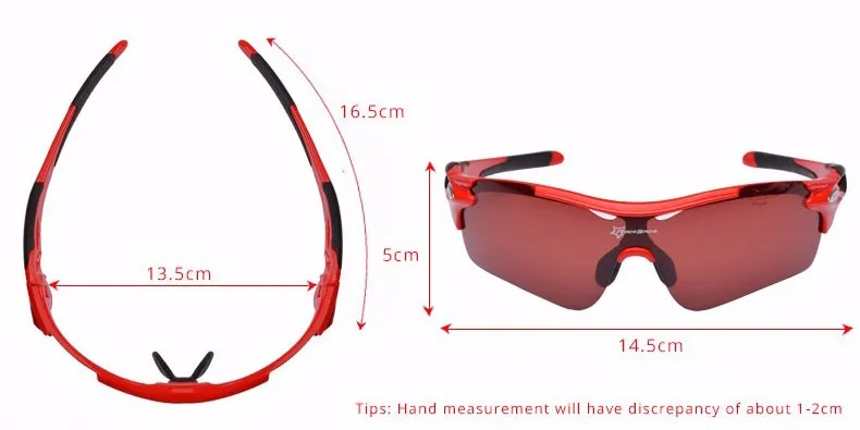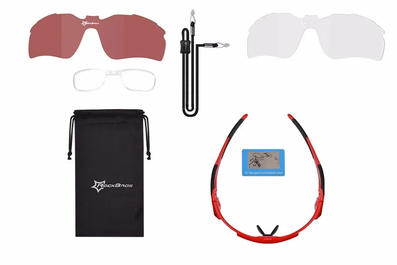 Style 2 ( 2 lens style) Product details: ROCKBROS Bike Polarized & Photochromatic glasses Gender: Unisex Attributes lenses: Polarized*1 & Photochromatic*1 Color: Black Red Weight: About 29g/pair Transmittance: 95%-8% (95% is transparent state when in low UV, 8% is the dark gray when in high UV) Lens Material: Polycarbonate,PC Material frame: Plastic Frame There are frames for fixing ordinary lenses Protection cyclist eyes from UV-400 UV (100% of UV protection) Non-slip nose pads is adjustable. Purpose: climbing,cycling, skiing, sledding children, fishing ,runing ,and all outdoor sports Specifications: 1 glasses and glasses cloth 1 1 glasses bag, 1 rope glasses and sunglasses 1 group 1 polarized lens test card 1 pair of polarized lenses (tawny color) and 1 pairs Photochromatic lenses (clear color) 1 Myopia frame Note:Color change time:winter- 1 minute ,summer-40 seconds. Speed depends on sunlight and UV intensity!