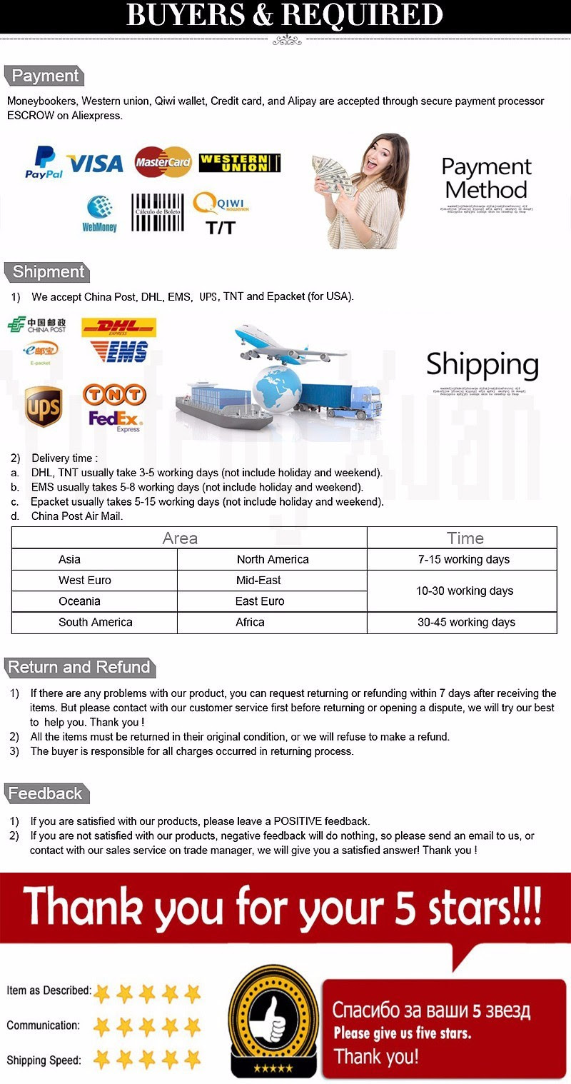 If the product you receive is not as described or low quality, the seller promises that you may return it before order completion (when you click "Confirm Order Received" or exceed confirmation timeframe) and receive a full refund. The return shipping fee will be paid by you. Or, you can choose to keep the product and agree the refund amount directly with the seller.N.B.: If the seller provides the "Longer Protection" service on this product, you may ask for refund up to 15 days after order completion.