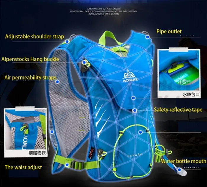Brand: AONIJIE Fabric: Waterproof Nylon Lining: Polyester Size: 25 x 42cm Backpack Capacity: 8L Water bag capacity: 1.5L Bag wet weight: 230g Gender: unisex Color: Black, Blue, Rose, Orange Function: Big storage, can store 1.5L water bag, phone, money, keychain etc. Usage: , travel, outdoor running, cycling, climbing, hiking etc. Package 1 X Running Backpack 1 X 1.5L Water Bag (optional)