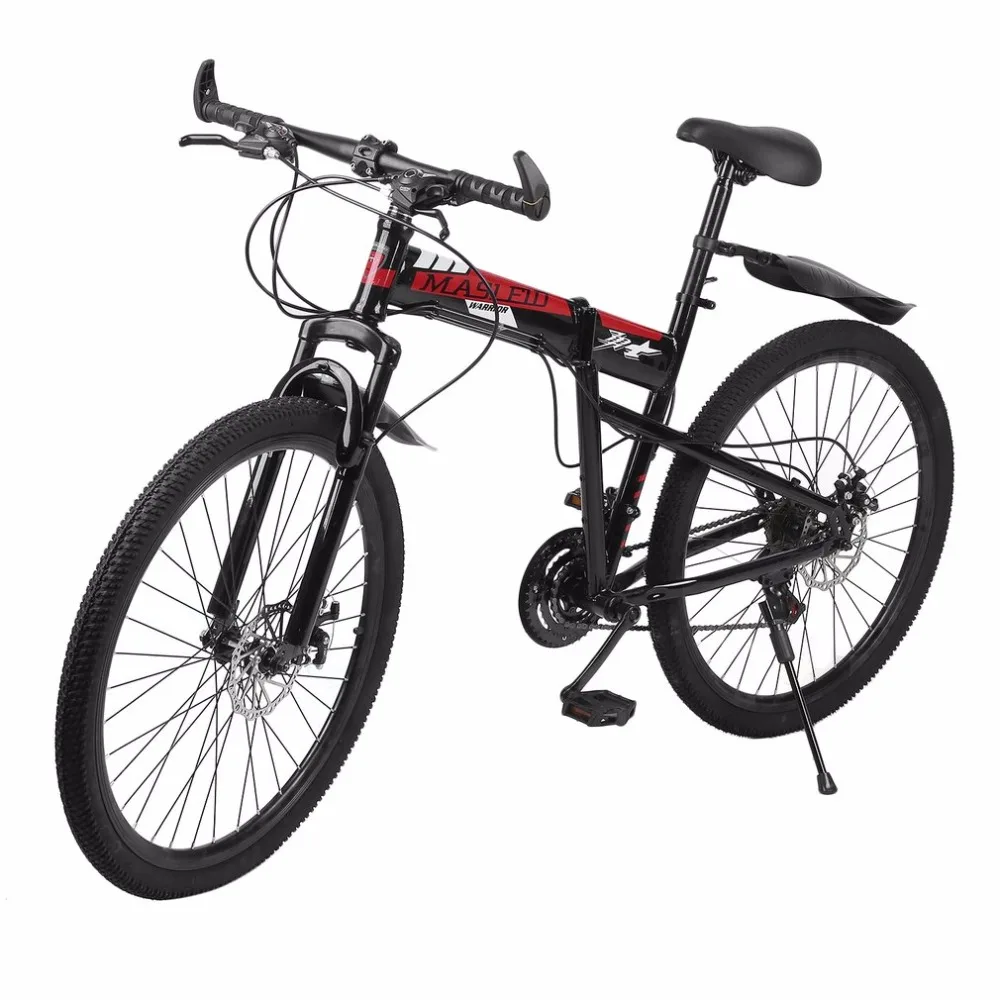 High Carbon Steel Double Disc Brakes Variable Speed Folding Bicycle Front Rear Mechanical Brake Mountain Racing BikeFeatures:Very easy tot folds and carry so you dont have to leave it outside.With full shockingproof frame, enrsures you a nice riding experience.Various speed allows yo to control and run the bike as you like.High carbon steel material, resistant to deformation and tensile. Sensitive and convenient, ensures you a high performance experience. Descriptions: 26 inches x17 inches folding bicycle.Load Capacity:150kgPropulsion Mode: Chain Brake System: double brake Frame Type: hard frame Pedal Type: ordinary pedalBrake Type: front rear mechanical brakeFront Fork Type: spring fork Specifications:Wheel Diameter:57cm(inner)/ 64cm(outer) Item Size:171*59*94cmPackage Size:136*17.5*71.5cmColor:white&red&blackMaterial:high carbon steel Package Included:1 X Folding Bicycle Notes:Please allow slight dimension difference due to different manual measurement.Due to the different monitor and light effect, the actual color of the item might be slightly different from the color showed on the pictures. Thank you!Return Policy